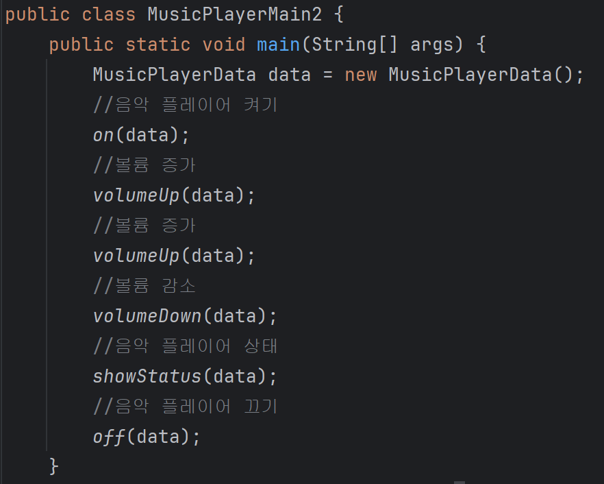 데이터와 기능은 매우 밀접하게 연관되어 있기에 데이터가 변경되면 `MusicPlayerMain2` 부분의 메서드들도 모두 함께 변경되어야 함. → 코드 유지보수 관점에서도 관리 포인트가 2곳으로 늘어남.