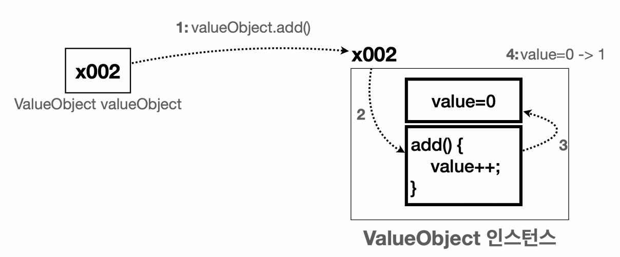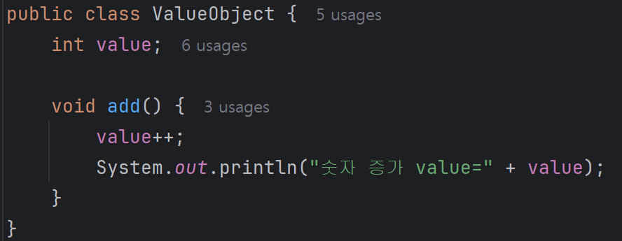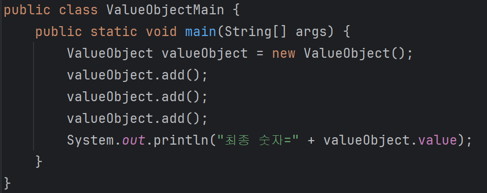 → ValueObject 클래스에 `add()` 메서드를 정의하였다. (`static void` 가 아닌 그냥 `void`)